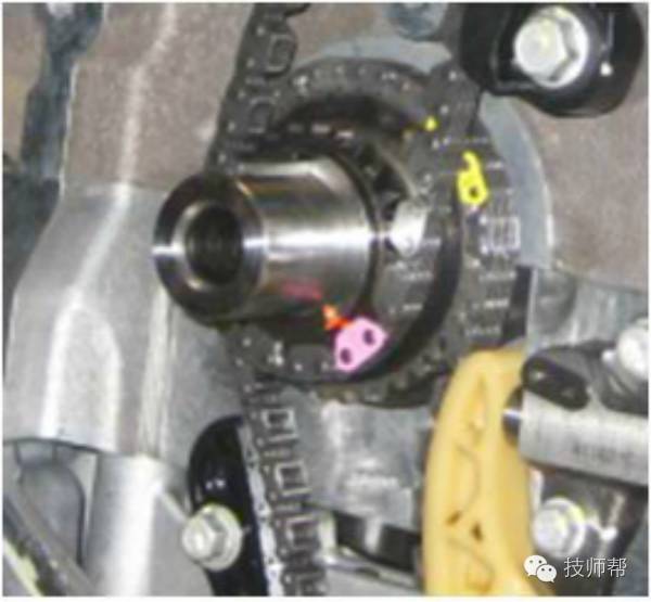 凸轮轴驱动链条带有两个分离黄色链节及一个粉色链节
