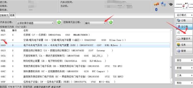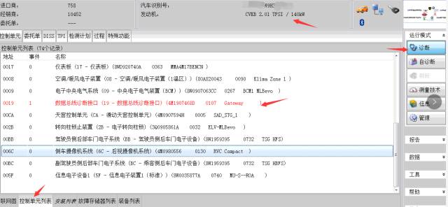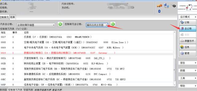 首先选择自诊断,在选入编码总线控制器,当然系统要选019就是网关了!