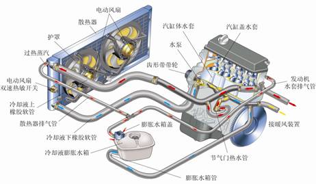冷却系统主要由水泵、散热器(水箱)、膨胀水箱(副水壶)、冷却水管、冷却液、节温器、水温传感器、冷却风扇、液位传感器、水温报警灯与水温表等组成。