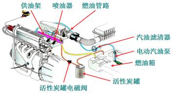 燃油喷射系统由燃油箱、燃油泵、燃油滤清器、燃油分配器、喷油器、油压调节器、燃油蒸汽回收装置等组成。
