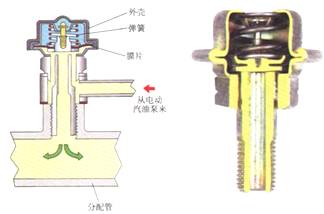 常温下石蜡呈固态,主阀门全关,封闭了通往散热器的水路;副阀门全开,来自发动机缸盖出水口的冷却水,经水泵又流回气缸体水套中,进行小循环。