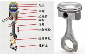 连杆:连接活塞和曲轴,并将活塞所受作用力传给曲轴,将活塞的往复运动变成曲轴的旋转运动。