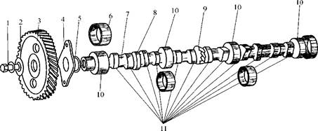 8—驱动汽油泵的偏心轮 9—驱动分电器的螺旋齿轮 10—凸轮轴轴颈 11—凸轮
