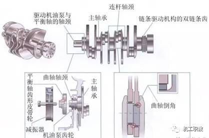 曲轴:承受来自连杆的力,将活塞的上下运动转变为曲轴的旋转运动并输出。