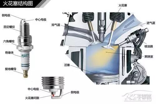 要想气缸内的“爆炸”威力更大,适时的点火就非常重要了,而气缸内的火花塞就是扮演“引爆”的角色。其实火花塞点火的原理有点类似雷电,火花塞头部有中心电极和侧电极(相于两朵带相反极性离子的云),两个电极之间有个很小的间隙(称为点火间隙),当通电时能产生高达1万多伏的电火花,可以瞬间“引爆”气缸内的混合气体。