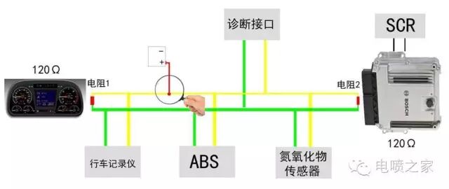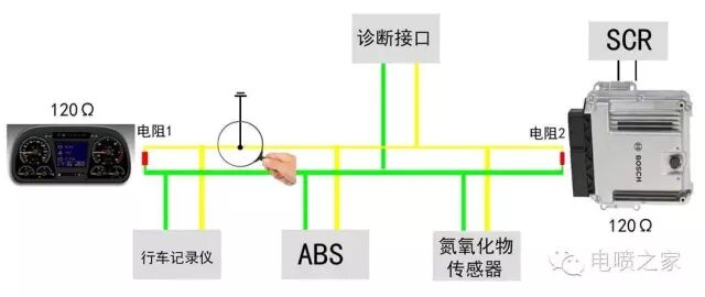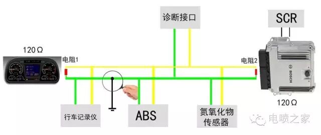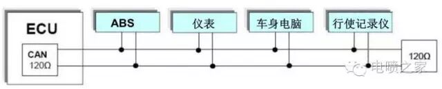 在汽车CAN总线首尾的终端分别安装设计了终端电阻!