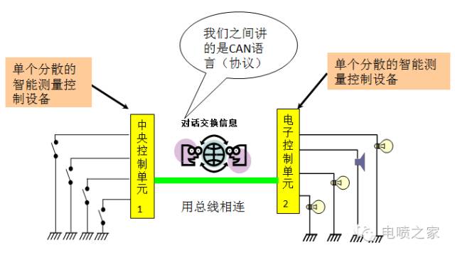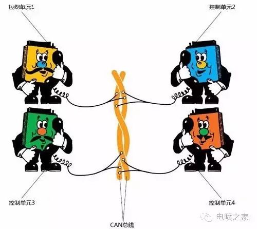 整个原理很类似于一个电话会议进行的方式,一个电话用户(控制单元)将数据“讲”入网络中,其他用户通过网络“接听”这个数据,对这个数据感兴趣的用户则会利用,其他用户则会选择忽略。