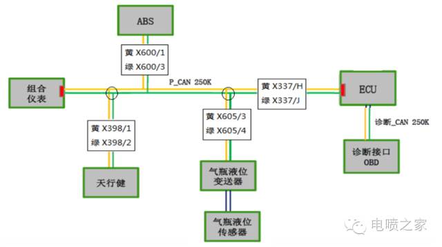 为了清楚起见 CAN导线分别用单颜色来表示 CAN-High 线总是黄色,CAN-Low-线总是绿色。(具体CAN线颜色在于主车厂家设计采用,按实际为准,一般设计的很好区别车辆其他线路)