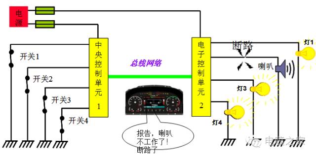 传统电气控制系统中电器元件比较多,多一个元件就会多一个故障点,如果需要增加或改变功能,那么就会涉及到更改线束、更改开关或者加装继电器等工作,更改麻烦。如果增加复杂功能:发动机故障中文显示、巡航等则无法实现。