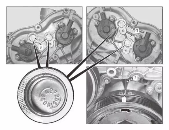07 如下图所示,皮带轮上的标记1必须与正时箱盖罩的定位缘2对齐,且脉冲轮上的标记3 必须位于传感器孔的中央。