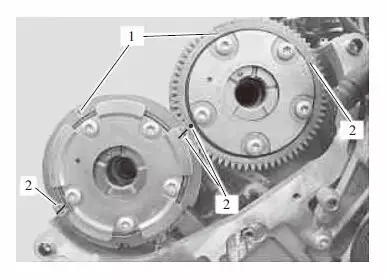 04 按下图所示,将右侧气缸盖上的排气凸轮轴和进气凸轮轴安装在基本位置。凸轮轴调节器上的标记1与顶部对准,凸轮轴调节器上的标记2与气缸盖外罩接触表面对准。