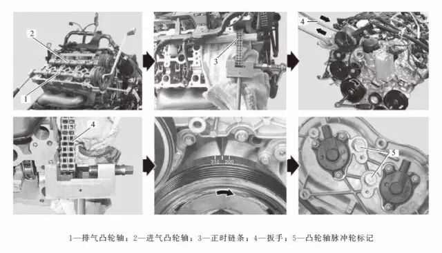 06 转动曲轴,然后在前护盖已安装到气缸盖上的情况下,在点火上止点前55°曲轴转角处检查凸轮轴的基本位置。
