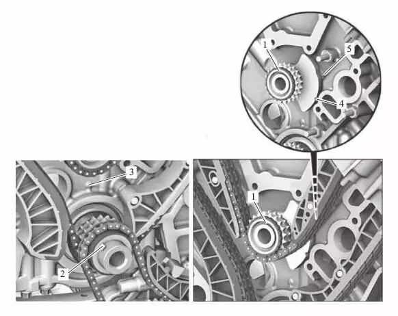 05 接着在点火上止点后40°的位置正确安装平衡轴1。装配销2必须对准曲轴箱上的标记3,并且前部平衡重上的槽口4必须对准标记5。